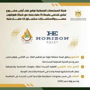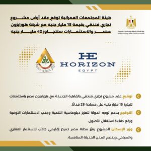 وقعت وزارة الإسكان، عقد تخصيص أرض مشروع تجاري فندقي متميز بمدينة القاهرة الجديدة، على مساحة تقارب 28 فدانًا، بقيمة تتجاوز 15 مليار جنيه مصري مع شركة هورايزون مصر للتنمية العمرانية، ، باستثمارات تتجاوز الـ 42 مليار جنية .