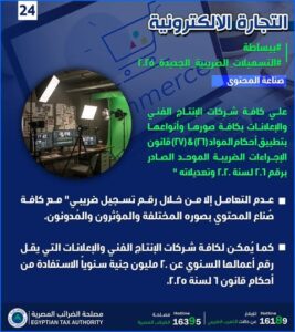 وأوضح الإنفوجراف أنه على كافة شركات الإنتاج الفني والإعلانات بكل صورها وأنواعها تطبيق أحكام المواد (26) و(27) قانون الإجراءات الضريبة الموحد الصادر برقم 206 لسنة 2020 وتعديلاته، “عدم التعامل إلا من خلال رقم تسجيل ضريبي” مع كل صناع المحتوى بصوره المختلفة والمؤثرين والمدونين.