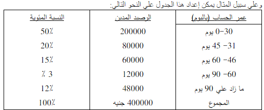 في هذا الصدد يمكن استخدام جدول أعمار المدينين Aging schedule في تحليل المدينين، وهذا الجدول يصنف المدينين بالنسبة إلي فترات عدم السداد.