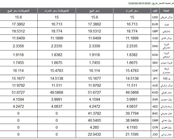 وسجل الجنيه الإسترلينى 16.83 جنيه للشراء و17.77 جنيه للبيع، وسجل الفرنك السويسرى 13.87 جنيه للشراء و14.65 جنيه للبيع، وبلغ الين اليابانى “100 ين” 13.12 جنيه للشراء و13.85 جنيه للبيع، وسجل سعر صرف اليوان الصينى 1.9 جنيه للشراء و2.11 جنيه للبيع.