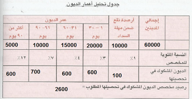 وفي السنه القادمة عند تكوين النسبة الجديده للمخصص يتم التسوية بالاضافه او التخفيض للمخصص ليكون قية النسبة