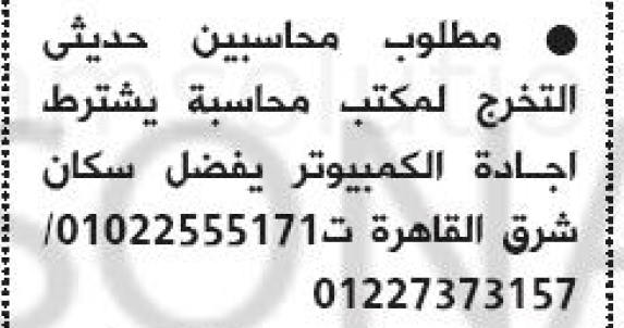 ذات صلة وظائف محاسب وظائف مارس 18, 2025 مطلوب محاسبين وظائف مارس 18, 2025 وظيفة محاسب تكاليف في مصنع اغذيه بالتجمع الثالث وظائف مارس 18, 2025 جمع وظائف محاسب وظائف مارس 18, 2025 تفاصيل الوظيفة مطلوب محاسب خبره من عام ل 5 اعوام... اقرأ المزيد مطلوب محاسبين وظائف مارس 18, 2025 تفاصيل الوظيفة مطلوب محاسبين خريجين حديث ملم بمعرفه حسابات الشركات... اقرأ المزيد وظيفة محاسب تكاليف في مصنع اغذيه بالتجمع الثالث وظائف مارس 18, 2025 تفاصيل الوظيفة مطلوب محاسب تكاليف – لمصنع اغذية بالتجمع الثالث –... اقرأ المزيد وظائف محاسب عام في شركه بالشيخ زايد وظائف مارس 18, 2025 تفاصيل الوظيفة مطلوب محاسب عام – للعمل بشركة Rosekids بالشيخ... اقرأ المزيد وظائف محاسب مبيعات في شركه عطور – الرياض وظائف مارس 18, 2025 تفاصيل الوظيفة مطلوب محاسب مبيعات – لشركة عطور – خبرة تلات... اقرأ المزيد وظائف محاسبين للعمل بمكتب محاسبة FacebookTwitterPinterestWhatsApp أبريل 6, 2016 مطلوب محاسبين للعمل بمكتب محاسبة للاتصال 01022555171-01227373157 المادة السابقةللعمل بشركة الحويفي للسيراميكالمقالة القادمةمطلوب مراجع داخلى للإدارة المالية لشركة