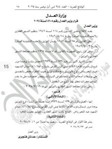 ونشرت الجديدة الرسمية قرار وزير العدل رقم 5608 لسنة 2025، والذى تضمن إنهاء العمل بالقرار رقم 139 لسنة 1972 فيما تضمنه من إنشاء فرع للتوثيق بوحدة مرور شمال وغرب القاهرة الكائنة بمبنى المرور الفرعى بشارع الجلاء (4) ميدان الشهيد عبد المنعم رياض، التابع لمكتب الشهر العقارى والتوثيق بجنوب القاهرة.